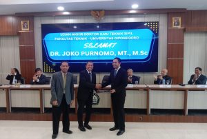 The Civil Engineering Doctoral Program of Universitas Diponegoro has graduated a doctoral student with a perfect grade, he is Dr. Joko Purnomo, ST., M.Sc. The exam was held on 2023 June 12th in the theatre, teleconference, and smart classroom of the Faculty of Engineering, Universitas Diponegoro with the team of examiners Prof. Ir. M. Agung Wibowo, M.M., M.Sc., Ph.D. (Chairperson/Examiner); Ilham Nurhuda, S.T., M.T., Ph.D. (Secretary of Session/Examiner); Prof. Dr. Ir. Sri Tudjono, M.S. (Examiner); Prof. Ir. Djwantoro Hardjito, M.Eng., Ph.D. (External Examiner); Prof. Dr. Ir. A.M. Ade Listono, M. Eng. (External Examiner), and also attended by family and colleagues.