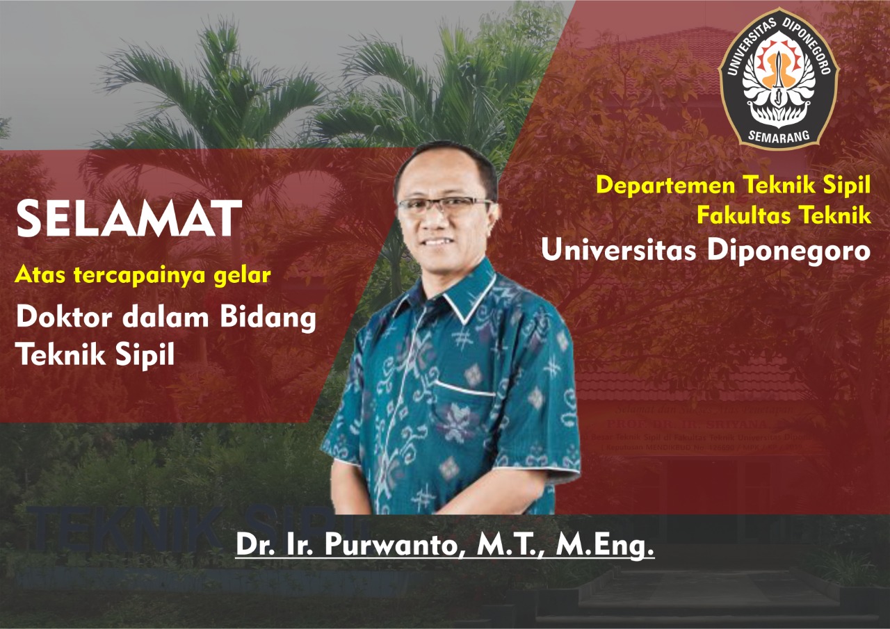 Ir. Purwanto, MT., M.Eng berhasil mempertahankan penelitiannya dihadapan Para Dewan Penguji, Berkat keberhasilannya Promovendus dinyatakan Lulus dengan predikat Cumlaude. Lama studi pada Doktor Ilmu Teknik sipil ditempuh 3 tahun 7 bulan 24 hari. Kini Lulusan Program Studi Doktor Ilmu Teknik sipil UNDIP bertambah menjadi 81.