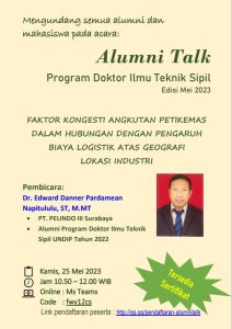 Program Doktor Ilmu Teknik Sipil (PDITS)UNDIP kembali menggelar seminar Alumni Talk pada edisi mei. seminar yang melibatkan para alumni PDITS dan mahasiswa yang bertujuan  berbagi Ilmu, shering pengalaman penelitian, dan juga menyambung tali silaturahmi.