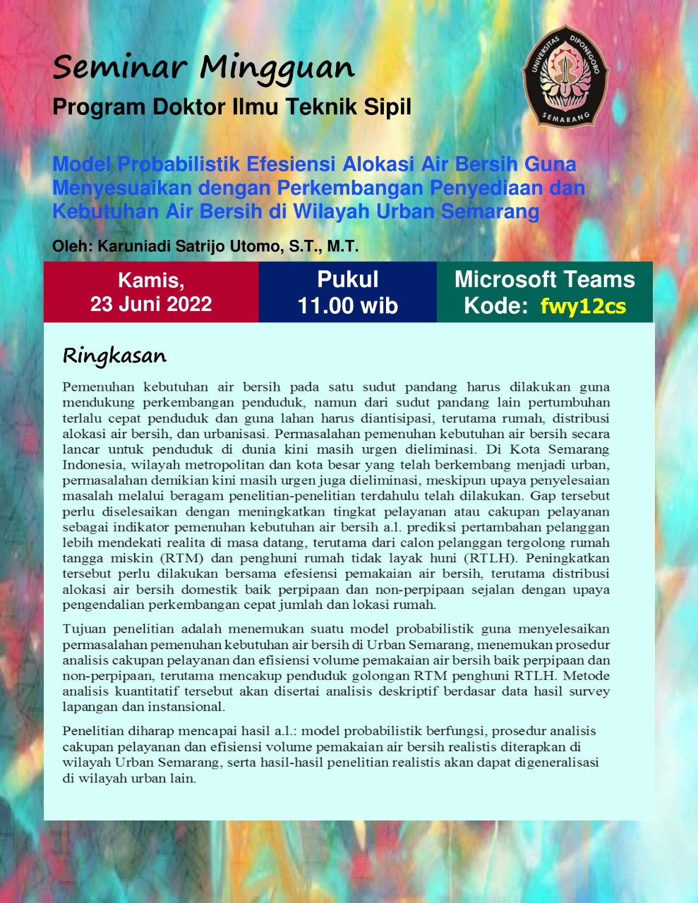 Model Probabilistik Efisiensi Alokasi Air Bersih Guna Menyesuaikan dengan Perkembangan Penyediaan dan Kebutuhan Air Bersih di Wilayah Urban Semarang |